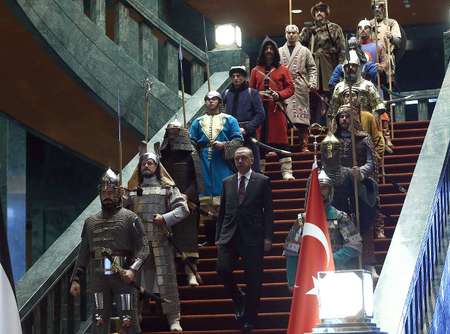 Erdogan recebeu o líder palestiniano no seu palácio novinho em folha de 1500 quartos que custou 490 milhões de euros acompanhado de 16 actores a representarem, cada um, um dos 16 impérios da história turca, num cenário que a oposição categorizou como, 'A Guerra das Estrelas chegou ao circo Otomano' e entendem ser sintoma da deriva autoritária e megalómana do dito cujo (ex-futebolista, agora atraso de vida profissional, digo eu). (esperam-se prisões a qualquer hora).