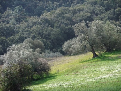 Hoje ao fim da tarde fomos fazer uma caminhadazinha na estrada dos Barris. Aquela hora está a Arrábida com um tom entre o dourado da seara e o verde dos pinheiros, dos choupos, dos ciprestes, das oliveiras, das figueiras, das nespreiras e romanzeiras. Uma paisagem mediterrânica. Um rebanho grande de ovelhas ia avançando devagar pela encosta ao som dos chocalhos. As alcachofras todas floridas. Cães que ladram ao longe, riachos que se avistam no meio dos choupos. Uma cena mesmo bucólica, parecida com algumas pinturas do século XIX. Uma beleza. Pena não ter levado a máquina... talvez amanhã...
