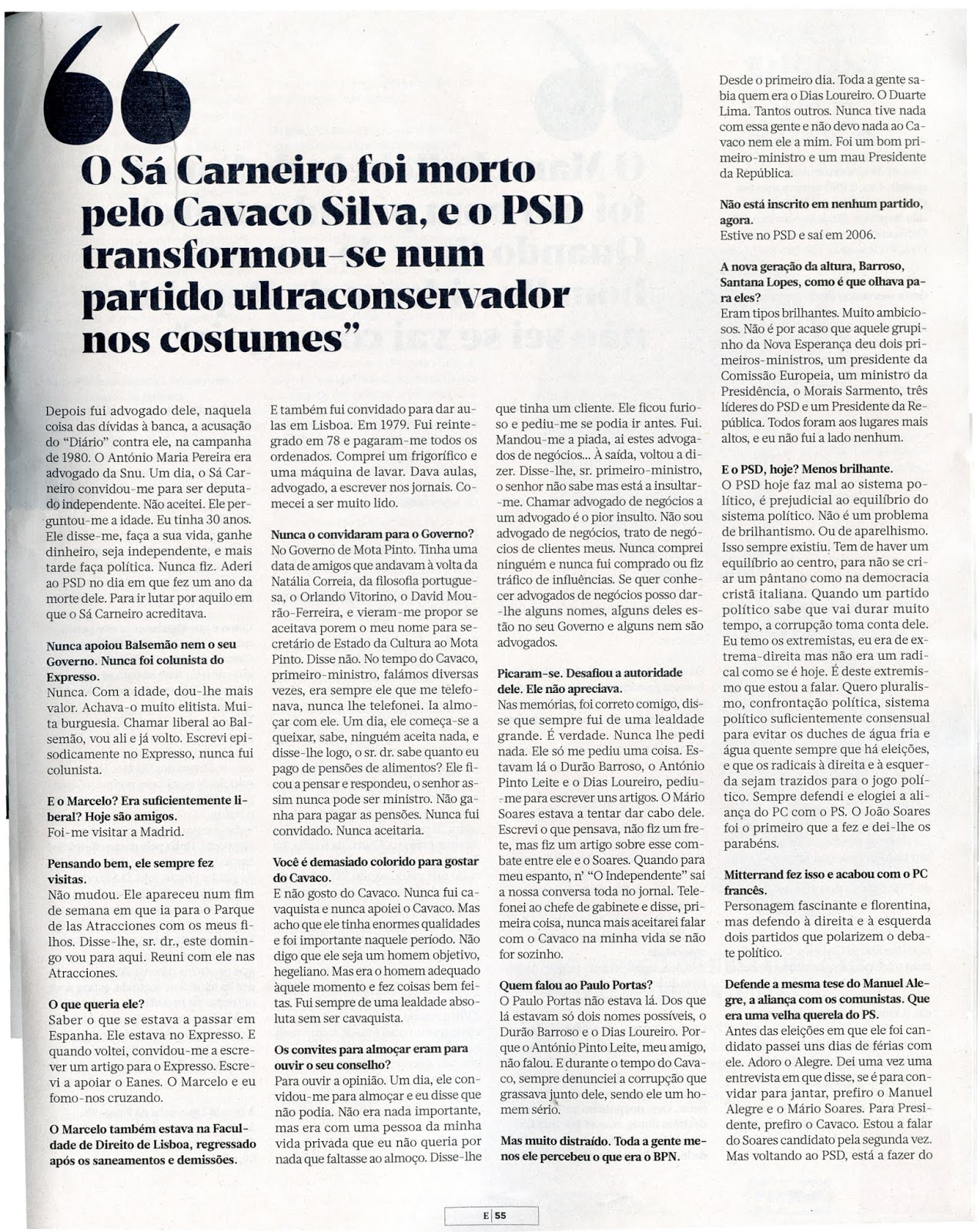 O PSD, diz, nunca teve pensamento político. O PCP, que ele admira, sim. Não se percebe se ele nunca ouviu falar dos crimes dos regimes soviéticos que o Cunhal tanto admirava e tentou trazer para cá.